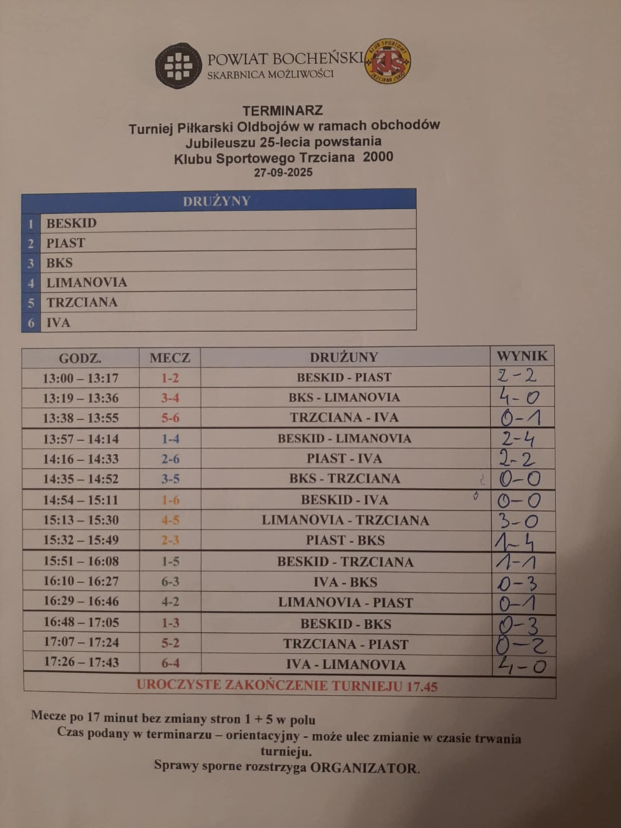 Do zawodów przystąpiło 6 drużyn oldbojów 35+ reprezentujących 3 sąsiadujące ze sobą powiaty: Beskid Żegocina, BKS Bochnia, Iva Iwkowa, Limanovia Limanowa, Piast Łapanów oraz gospodarze Trzciana 2000.