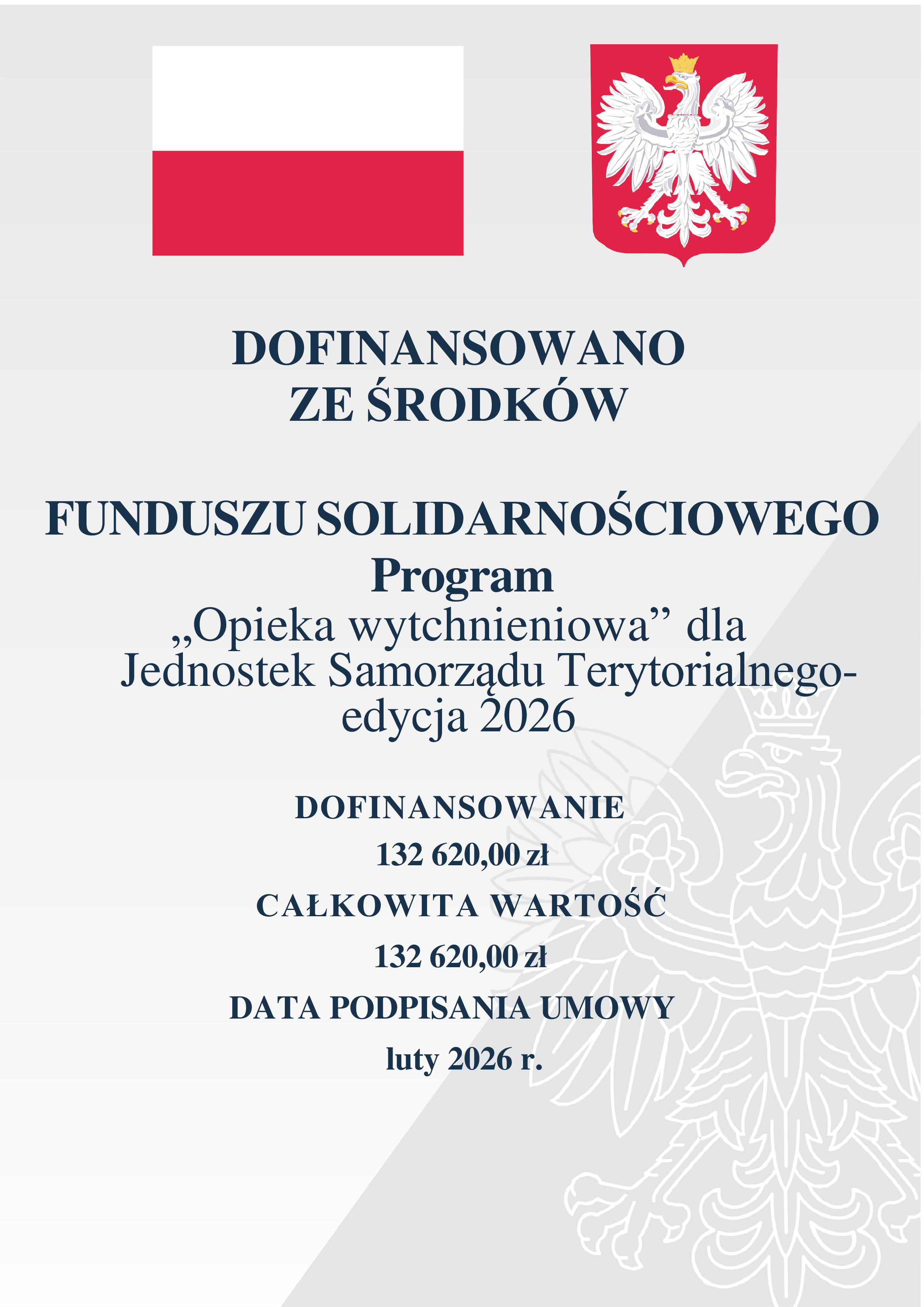 Całkowita kwota sfinansowania zadania ze środków Funduszu Solidarnościowego w 2026 r. wyniesie 132 620,00 zł.