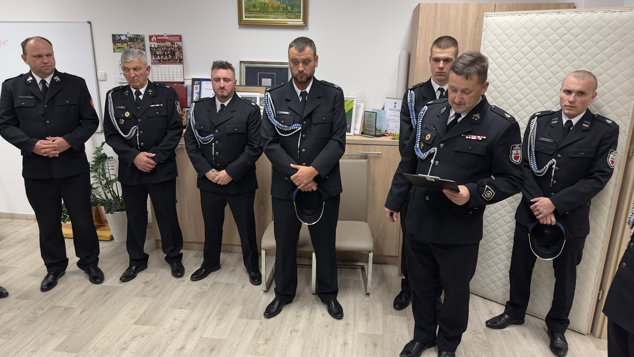 W budynku urzędu gminy odbyła się uroczystość przekazania sprzętu zakupionego w 2025 roku w ramach dotacji, dofinansowań oraz ze środków własnych OSP Trzciana.