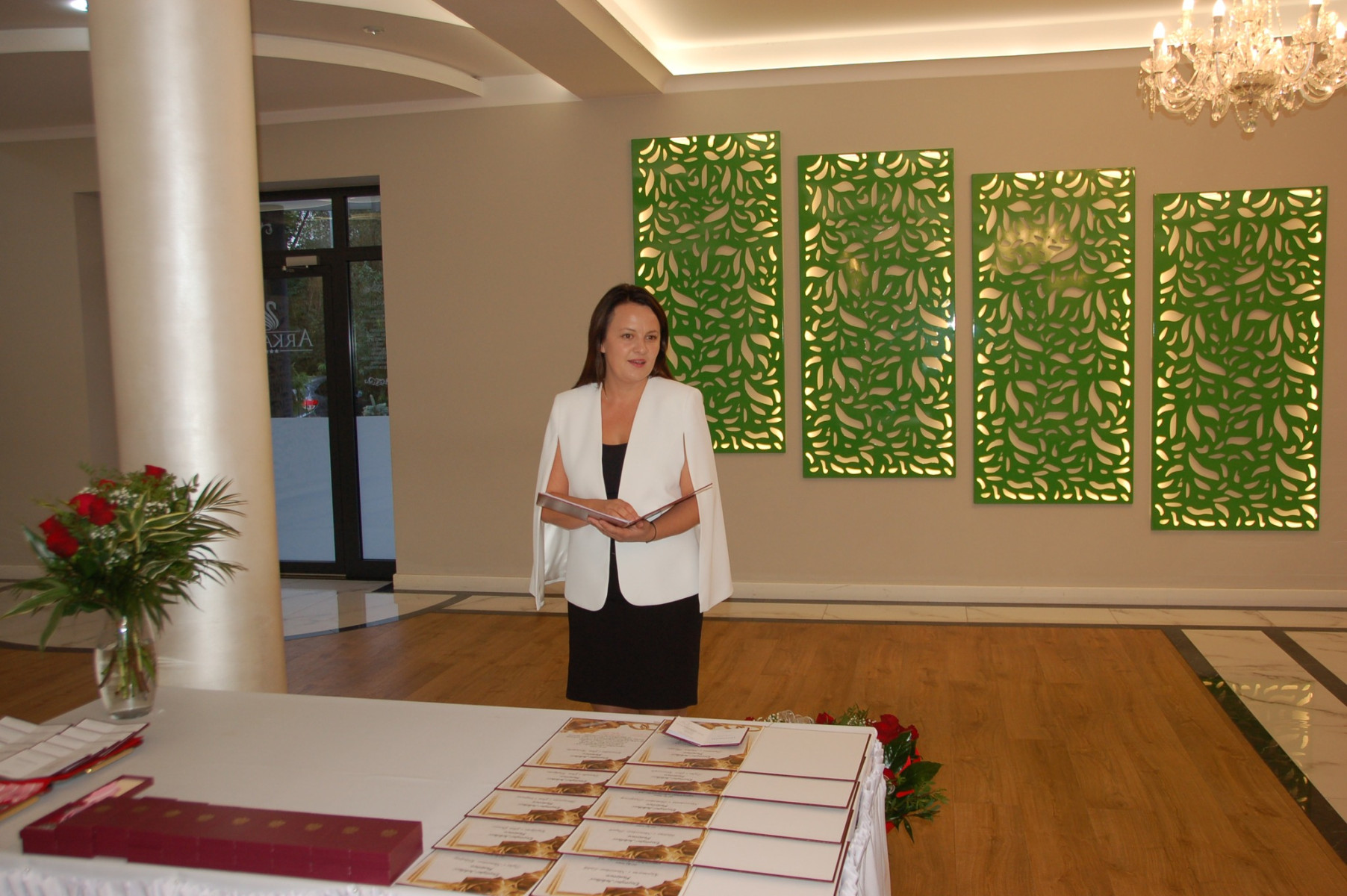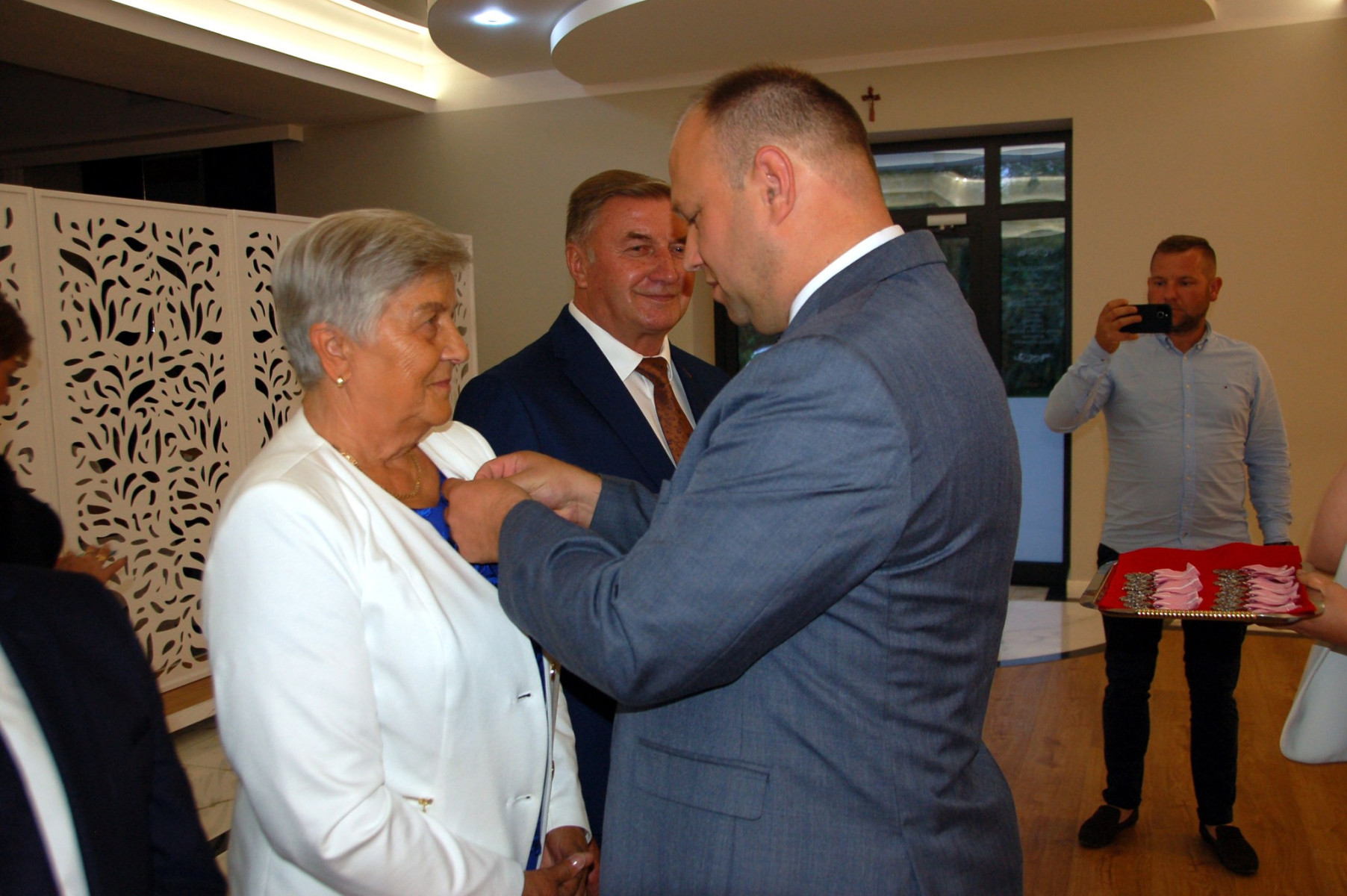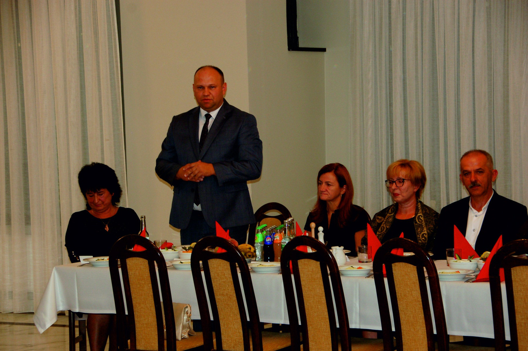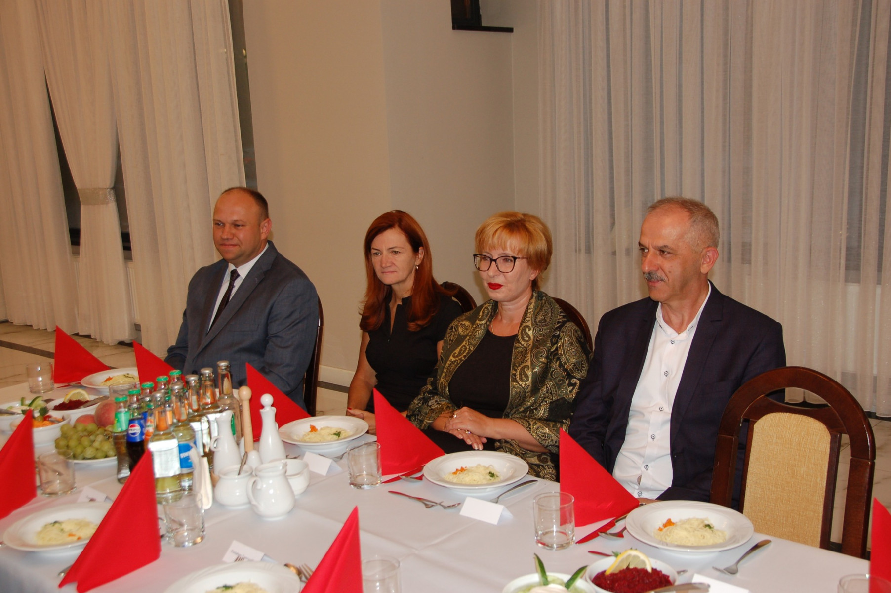 Przybywających do sali Jubilatów i gości już w progu witała główna organizatorka uroczystości Paulina Mech- Kierownik Urzędu Stanu Cywilnego w Trzcianie. Punktualnie o godzinie 18:00 rozpoczęła się uroczystość. Powitano i przedstawiono Jubilatów oraz gości samorządowych: Wójta - Cezarego Stawarz, byłą Sekretarz Gminy Trzciana- Wandę Surma oraz Przewodniczącą Rady Gminy-Renatę Paruch.