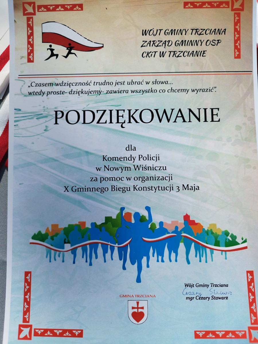 Dziękujemy policji KPP Nowy Wiśnicz, OSP Trzciana, OSP Rdzawa za zabezpieczenie trasy biegu .