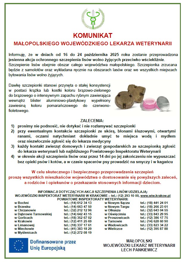 Małopolski Wojewódzki Lekarz Weterynarii informuję, że w dniach od 16 do 24 października 2025 roku zostanie przeprowadzona jesienna akcja ochronnego szczepienia lisów wolno żyjących przeciwko wściekliźnie.