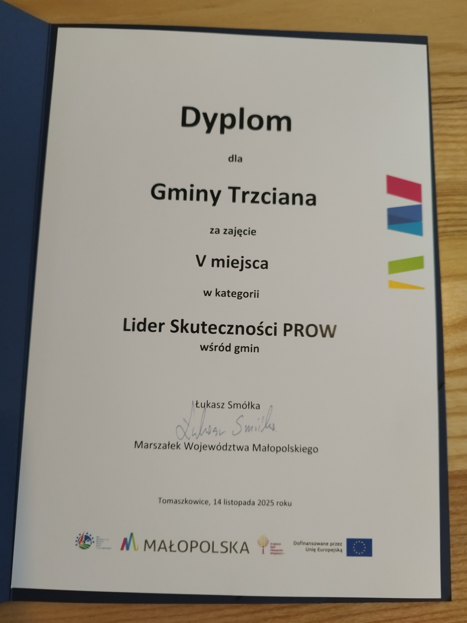 14 listopada Wójt Gminy Trzciana Cezary Stawarz odebrał w Tomaszkowicach z rąk Marszałka Województwa Małopolskiego Pana Łukasza Smółki statuetkę Lidera skuteczności PROW dla Gminy Trzciana.