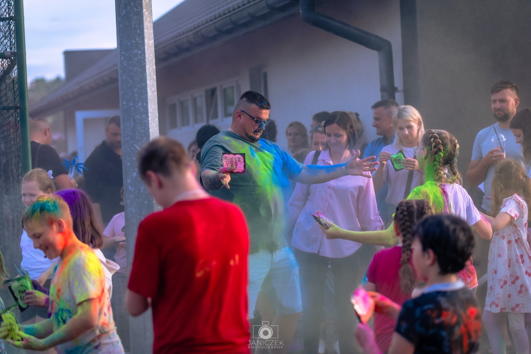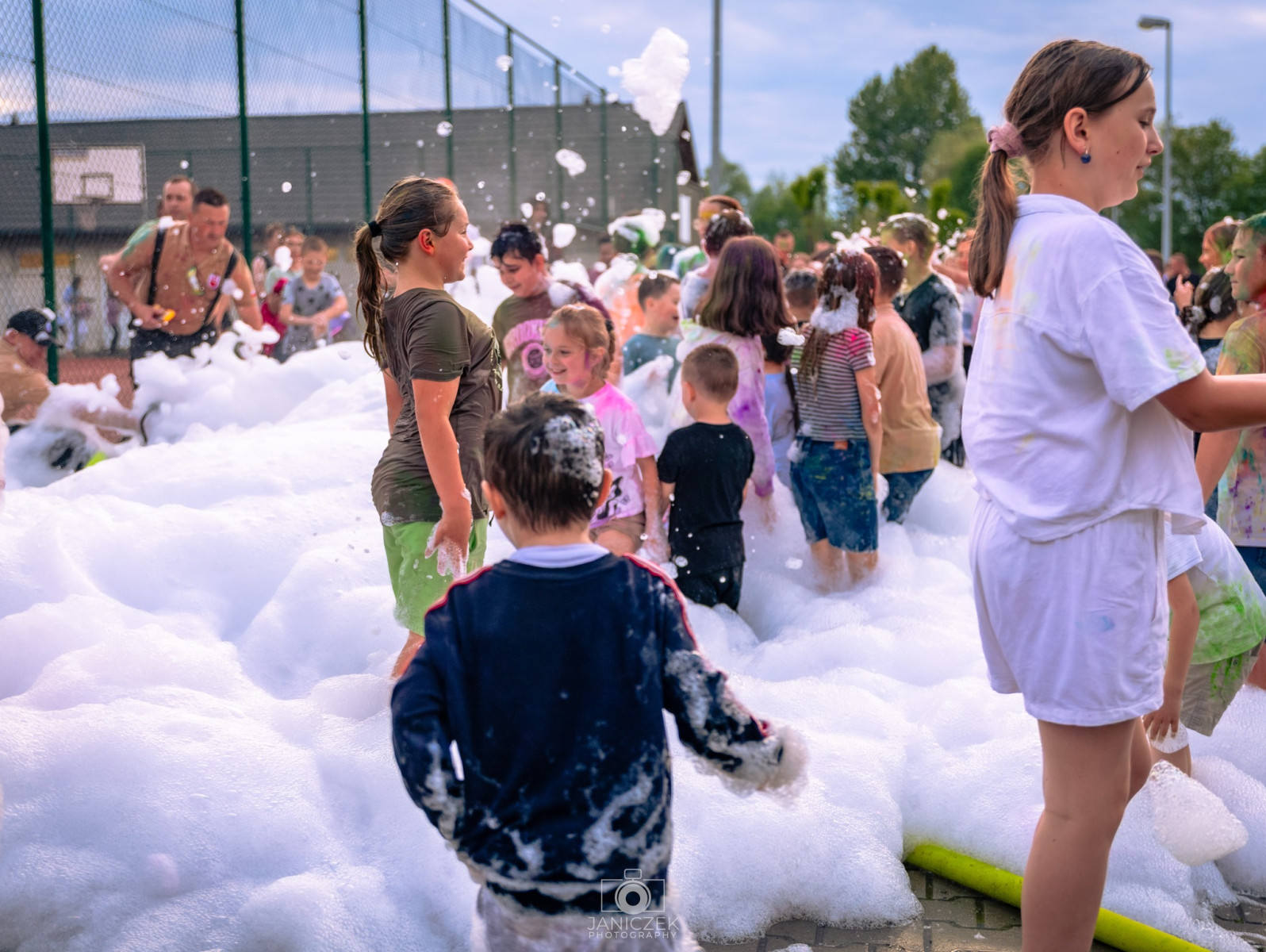 Chwilę później na dzieci czekały kolejne atrakcje - kurtyna wodna, następnie wielka bitwa kolorów, a po niej przygotowana przez strażaków z OSP KSRG Trzciana piana party!