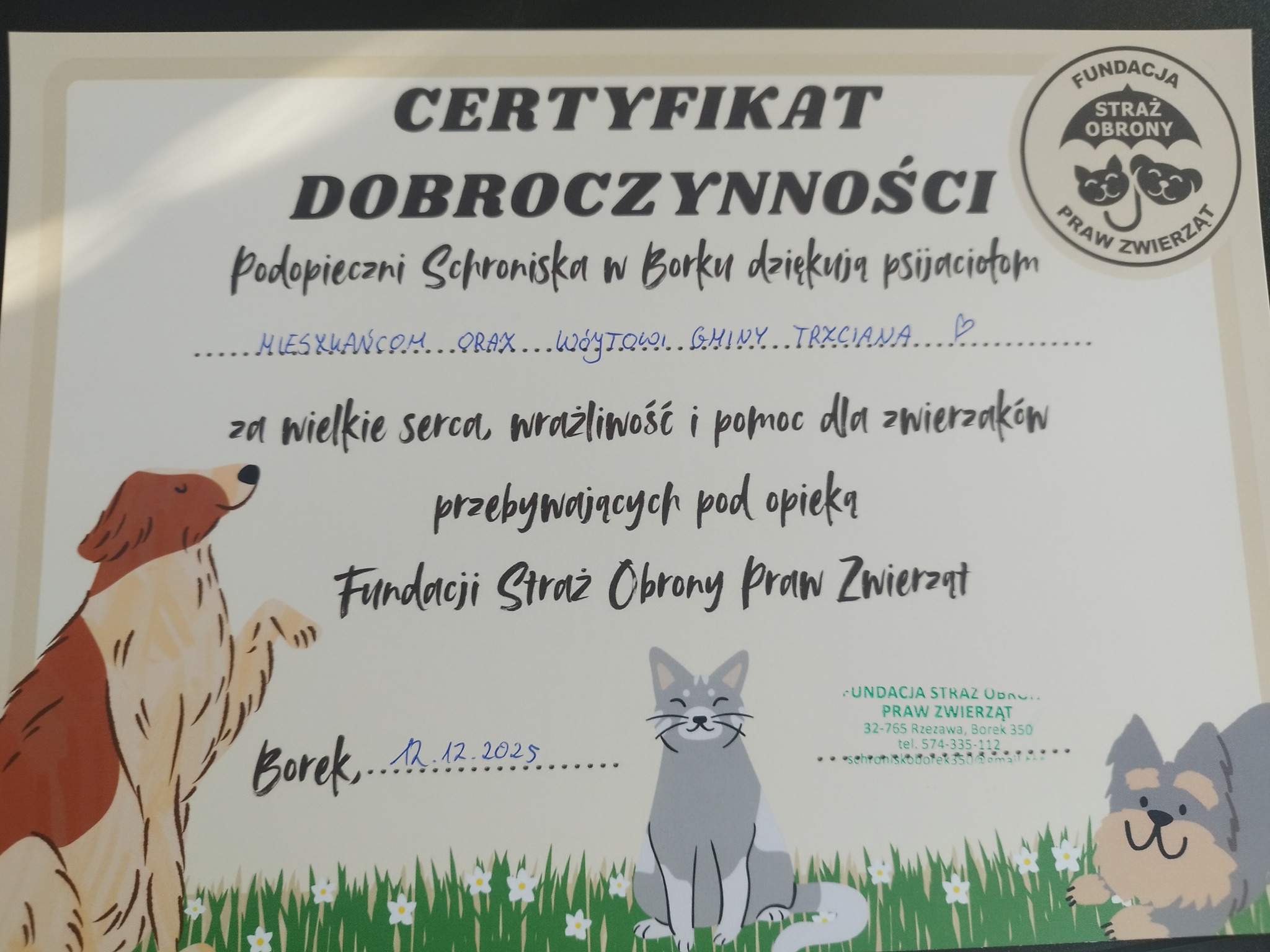 12 grudnia Wójt Gminy Trzciana Cezary Stawarz z inicjatywy Sołtys Leszczyny Bożeny Krawczyk oraz Sołtys Ujazdu Darii Kolasy przekazali dary dla zwierzaków Schroniska w Borku.