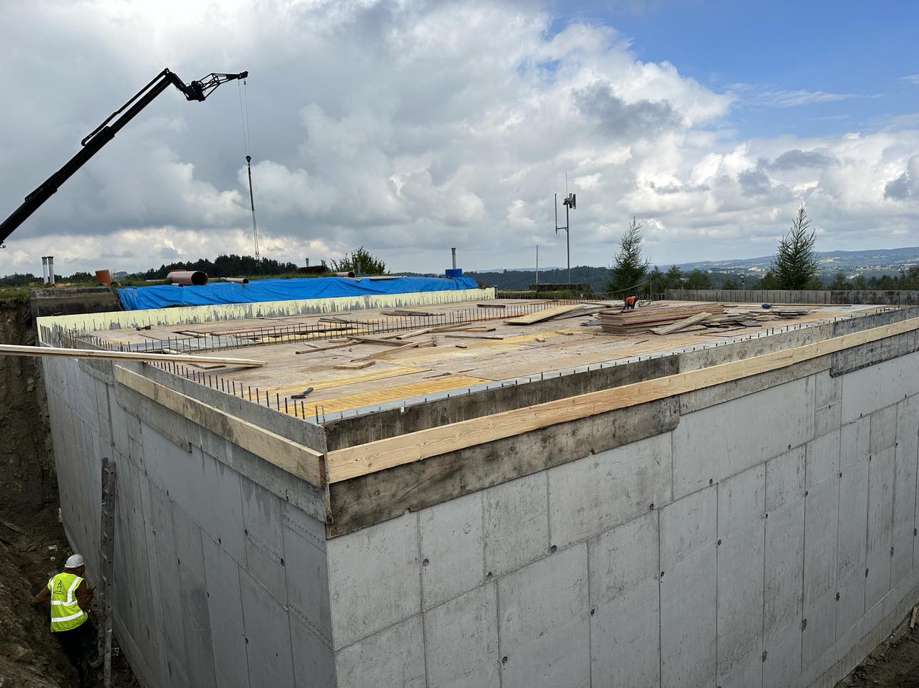 Na dzień dzisiejszy w obu zbiornikach wykonywane jest zbrojenie, w większym ( o pojemności 500m3) jest to zbrojenie stropu, w mniejszym (o pojemności 200m3) ścian. Prace idą zgodnie z harmonogramem.