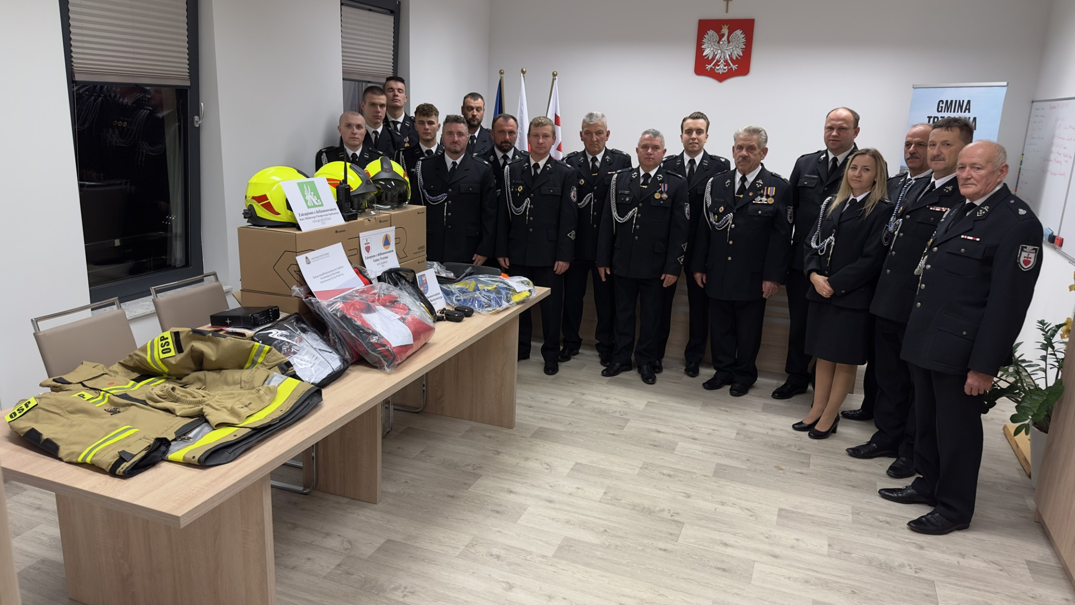 W budynku urzędu gminy odbyła się uroczystość przekazania sprzętu zakupionego w 2025 roku w ramach dotacji, dofinansowań oraz ze środków własnych OSP Trzciana.