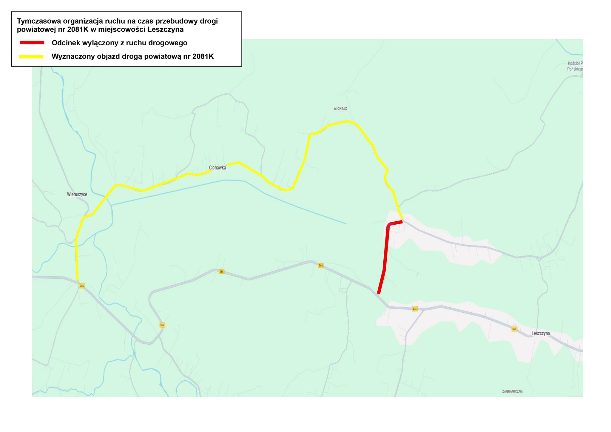 Powiatowy Zarząd Dróg w Bochni informuje, że w dniach od 3 do 8 grudnia 2025 r. nastąpi całkowite zamknięcie odcinka drogi powiatowej nr 2081K w miejscowości Leszczyna.