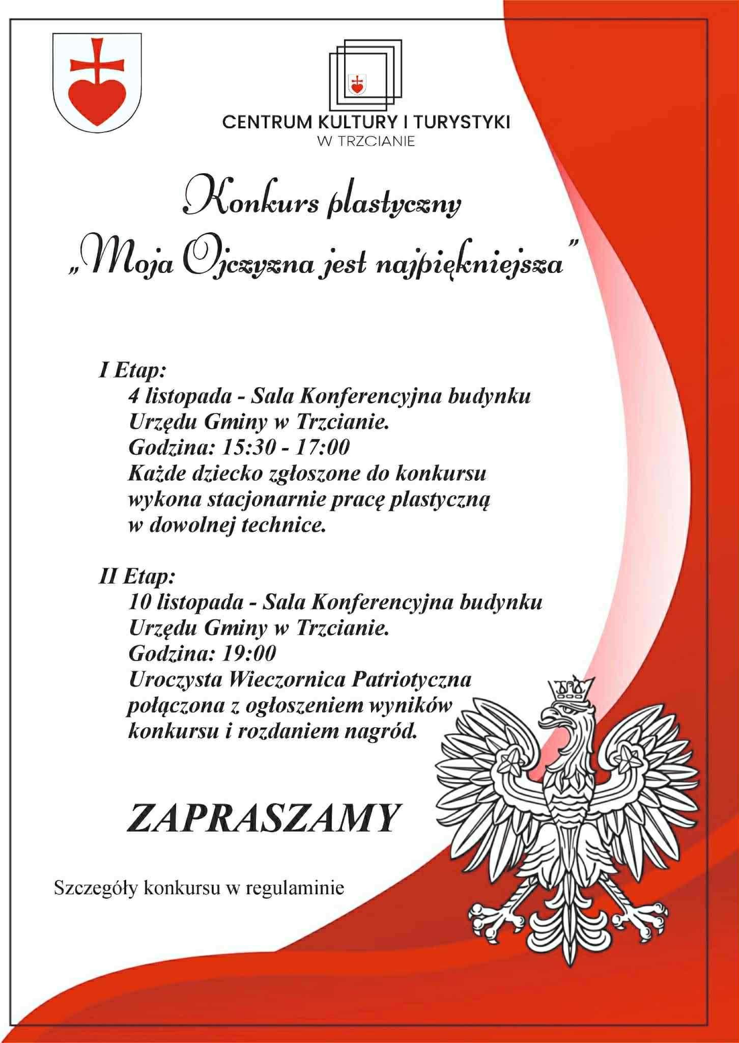 W związku z tym pięknym, historycznym dniem pragniemy serdecznie Państwa zaprosić do wzięcia udziału w Konkursie Plastycznym pt: „Moja Ojczyzna jest Najpiękniejsza” który odbędzie się stacjonarnie w Sali Konferencyjnej Urzędu Gminy w Trzcianie 4 listopada 2025r. w godzinach 15:30-17:00.
