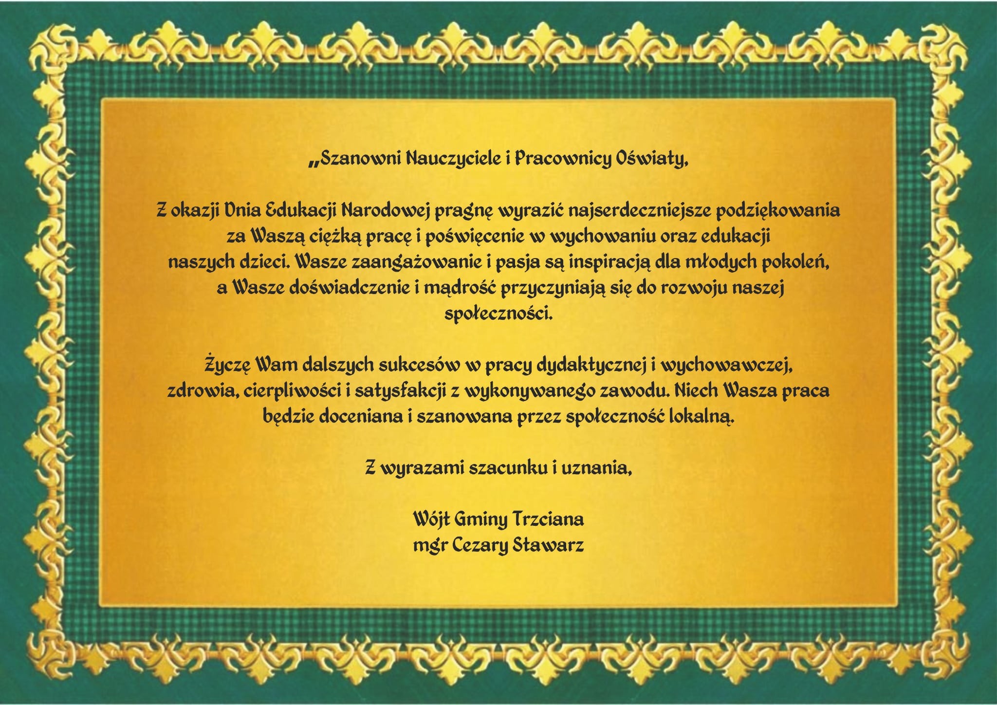 Z okazji Dnia Edukacji Narodowej pragnę wyrazić najserdeczniejsze podziękowania za Waszą ciężką pracę i poświęcenie w wychowaniu oraz edukacji naszych dzieci. Wasze zaangażowanie i pasja są inspiracją dla młodych pokoleń, a Wasze doświadczenie i mądrość przyczyniają się do rozwoju naszej społeczności.